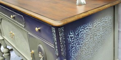 This beautiful buffet with large top drawer and four cabinet drawers is perfect for a dining area, entrance or kitchen. Blended from deep purple, to dark gray to light gray, this combination is stunning.
