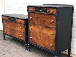 Beautiful dressers from the 1920s. Burl wood fronts, tops and sides have been painted with black chalk paint and topcoated for protection.