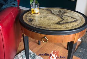 This beautiful Baker side table will class up anyone's study or family room! Featuring a 1711s map of the Americas, the legs and rim are painted black the top has a high gloss epoxy protecting it!